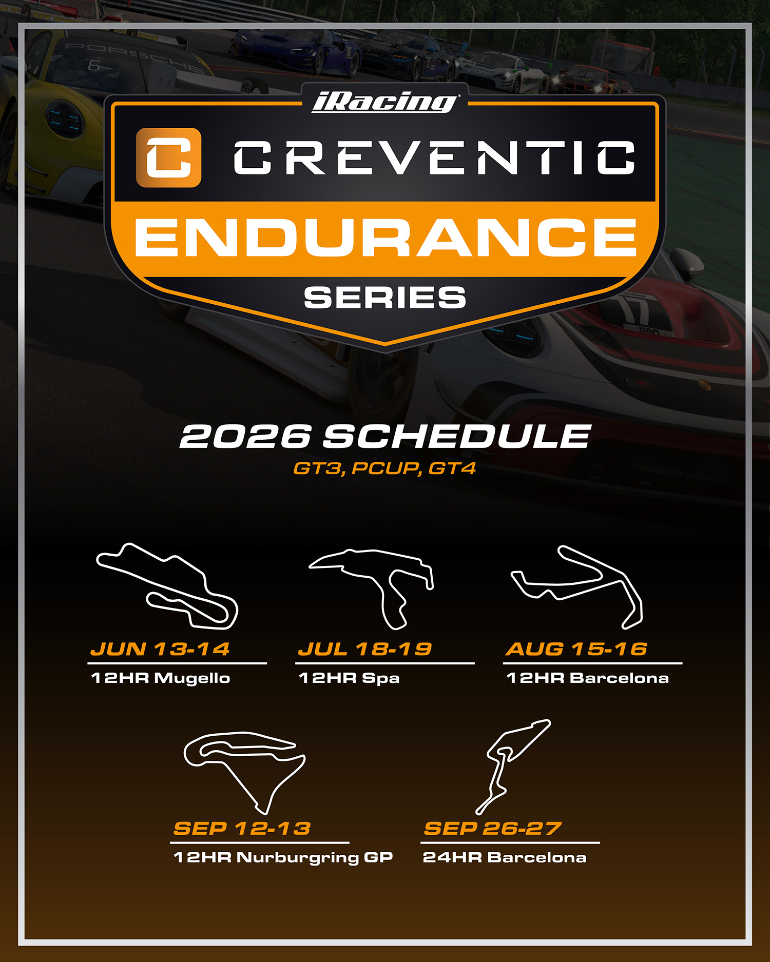 The 2026 calendar has been structured to align as closely as possible with real-world Creventic events while being designed to minimize overlap with other special events and series within iRacing. The season builds through the summer before culminating in a 24-hour race at Barcelona that closely mirrors its real-world counterpart.